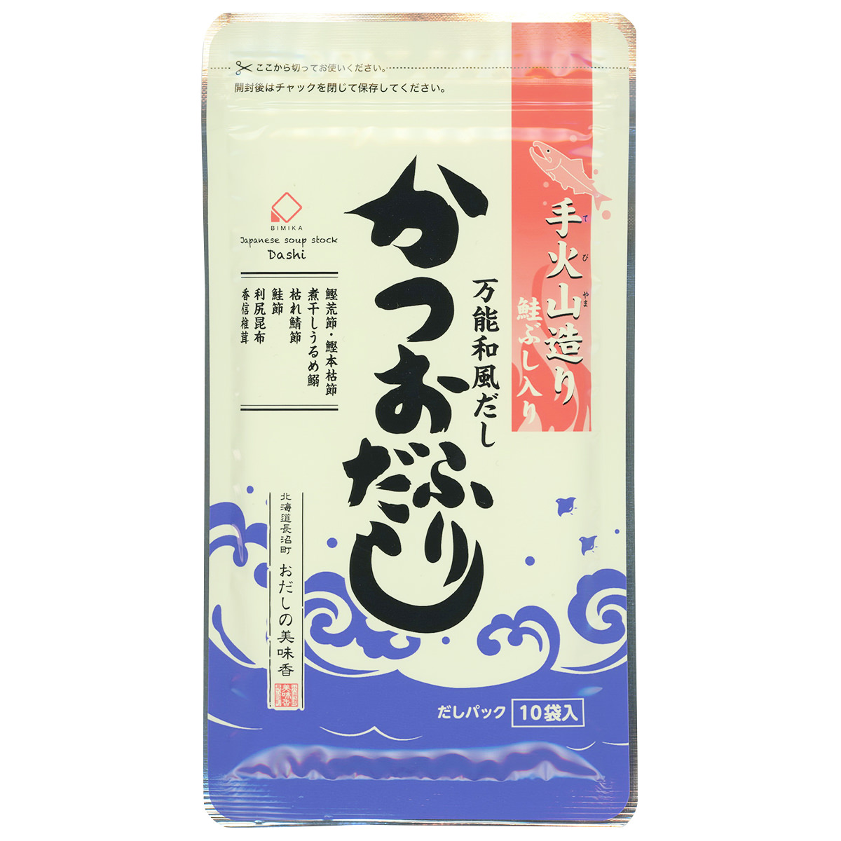 美味香の「鮭ぶし入りかつおふりだし」10P入10袋セットです。北海道・知床標津産の手火山造り鮭ぶしを含む、国内産のかつお節、うるめいわし節、さば節、利尻昆布、香信しいたけの6種類の素材の合わせだしです。だしパックですので、お手軽に美味しいだしが作れます。保存料、甘味料、着色料は使用しておりません。
